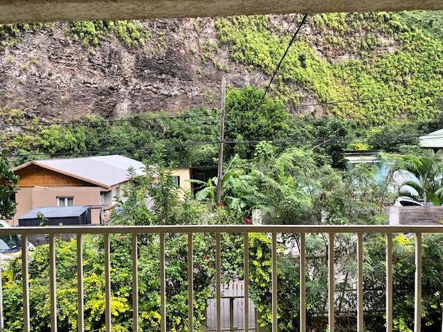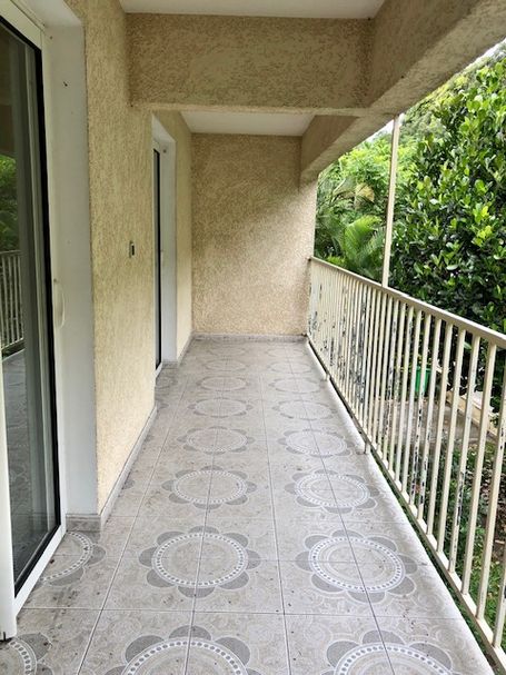 Une grande salle de bains, une grande pièce de vie avec cuisine, un coin salon, un grand balcon donnant sur la façade de la maison.